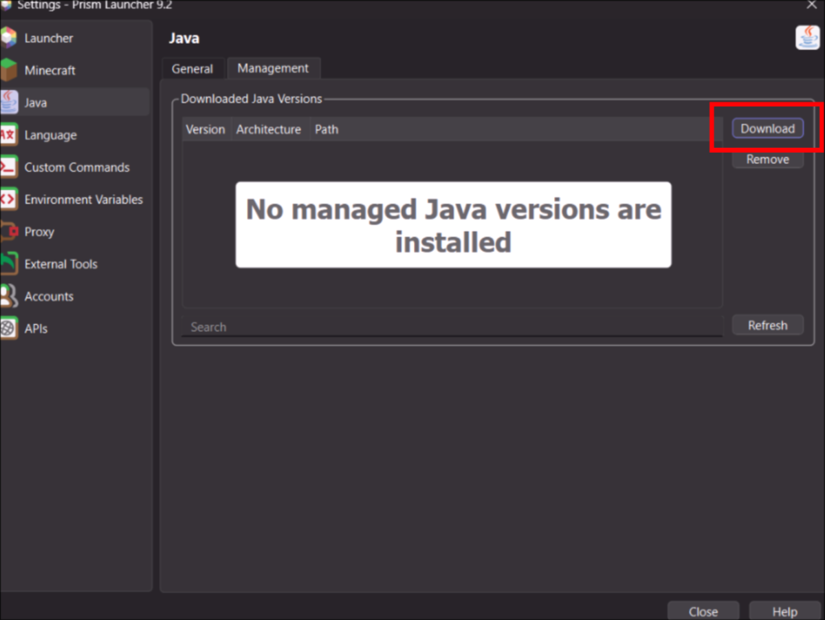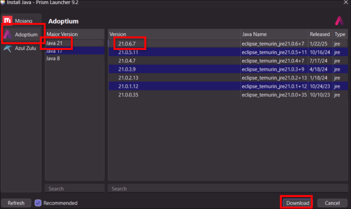 11. Choose Adoptium on the Left Java 21 and the top Version. Then Download
