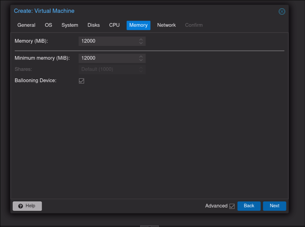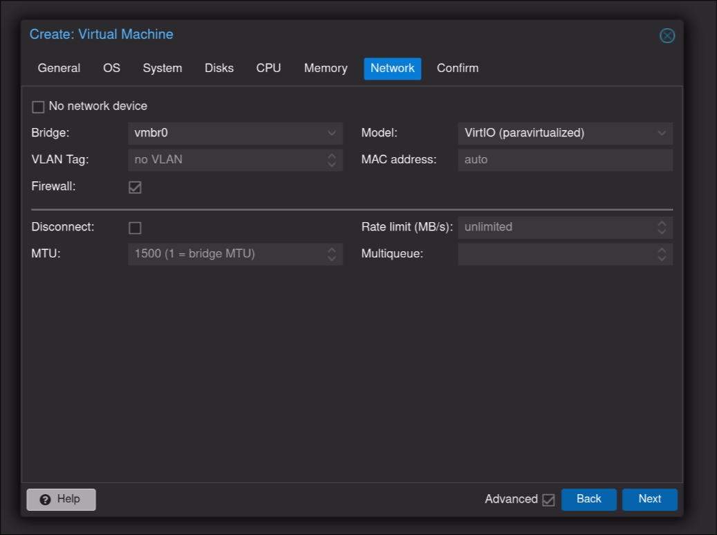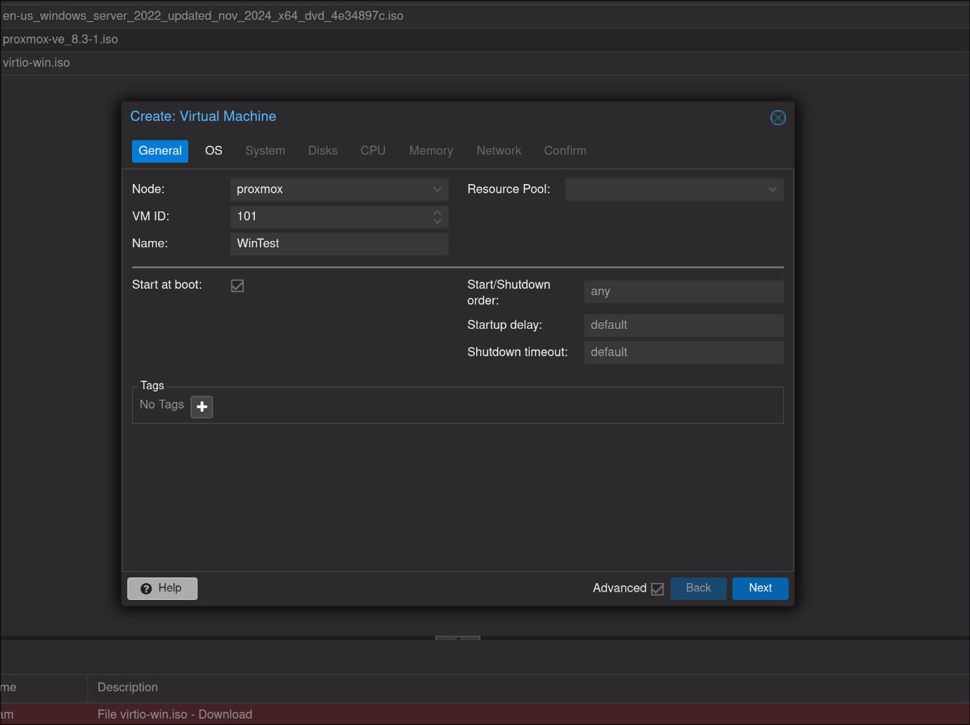 1. Choose Create new VM in the top right. I recommend checking the Advanced option and checking Start on boot. Click next after the general info is filled out.