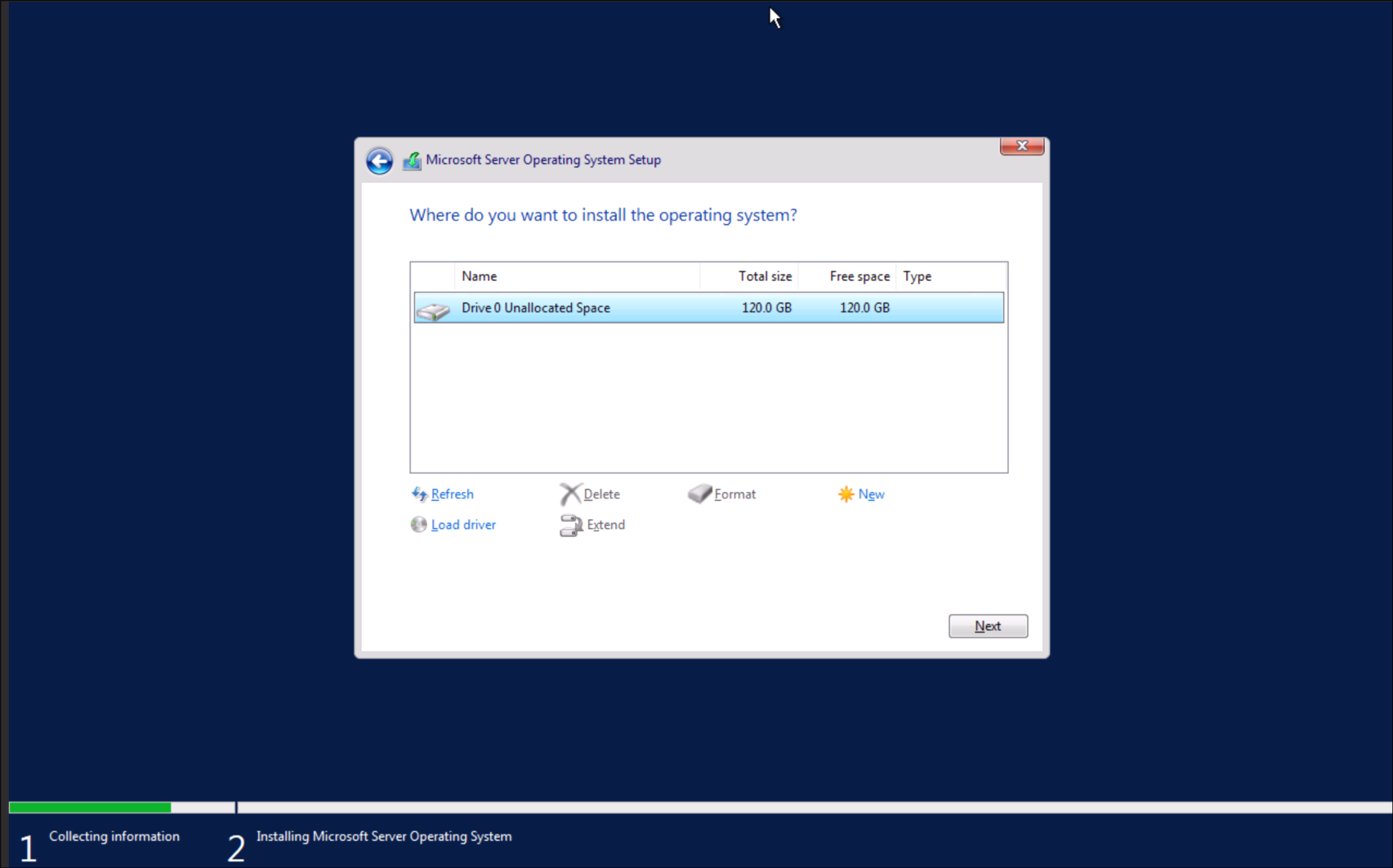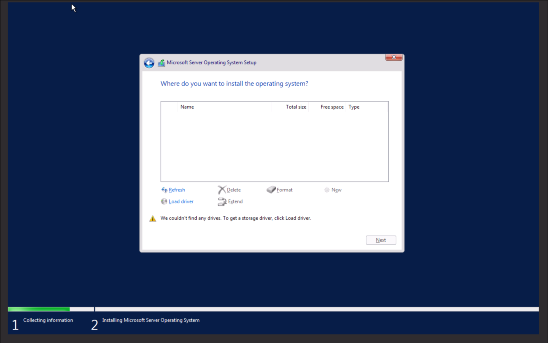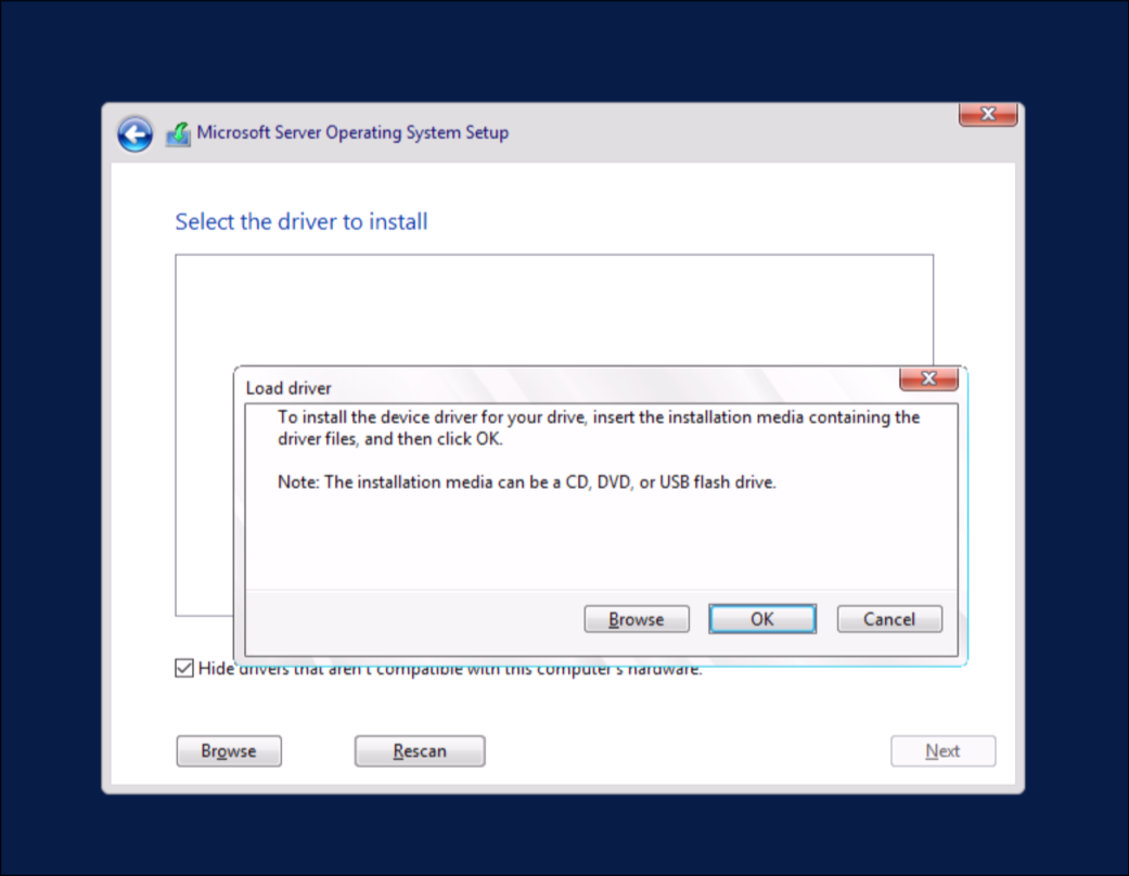 11. Follow through with the standard windows install. When you choose a disk make sure to choose Load Driver and then press OK. Any of the options should work. You can now pick the drive.