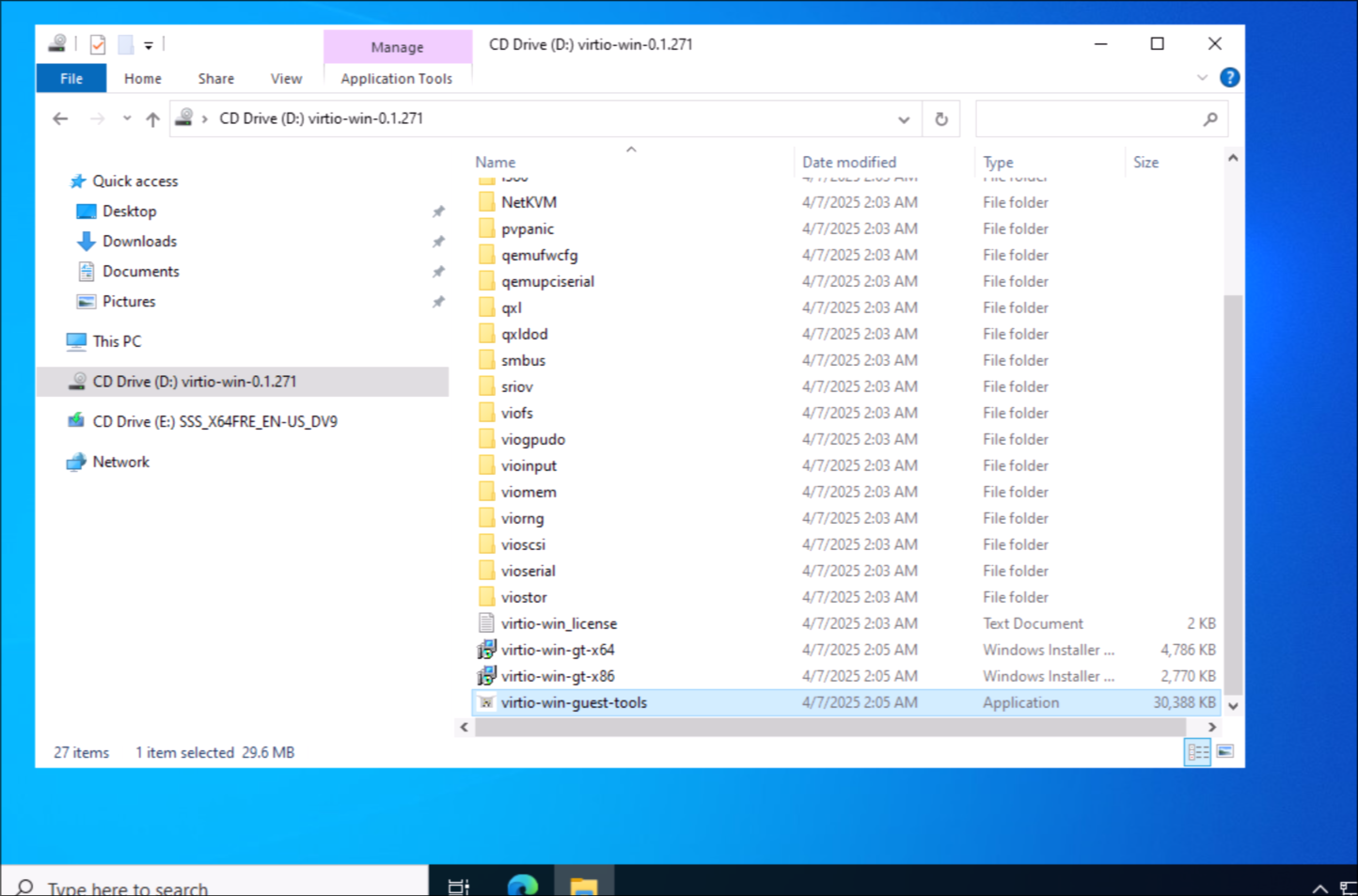 12. Continue with the windows install. After logging in go to the VirtIO Drive and run the virtio-win-guest-tools. Click next through all the dialogue. Restart after finishing