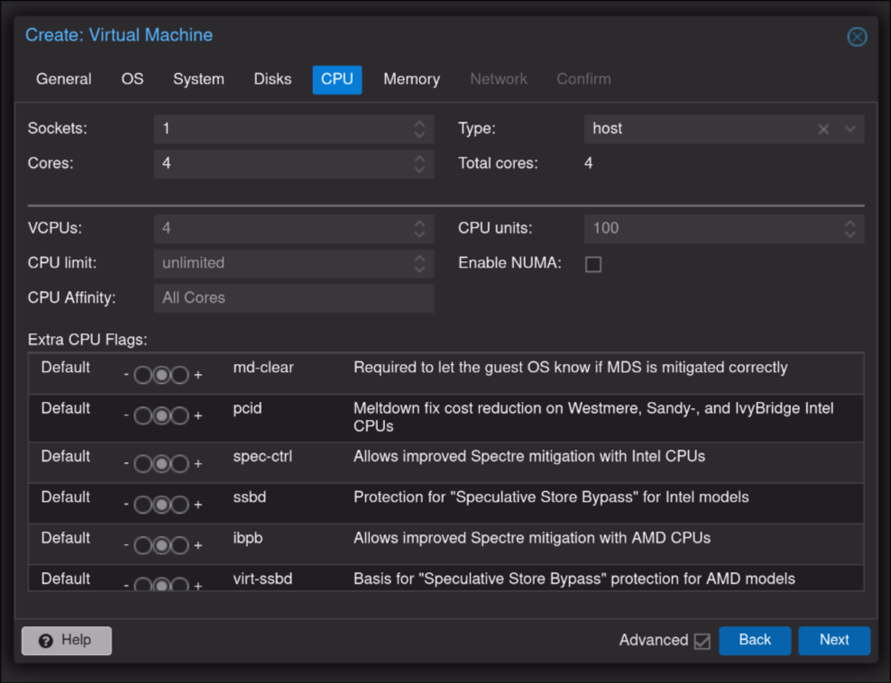 All the options used are for optimal performance and compatibility. I got this information from the official Proxmox wiki. If planning on changing settings or more info is needed would recommend reading it.