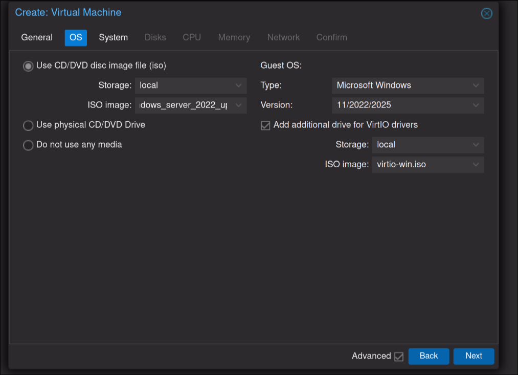2. Choose the ISO to boot with on the left and change the guest type on the right to match it. Make sure to check the Add additional drive for VirtIO drivers and choose the virtio-win.iso. Click Next